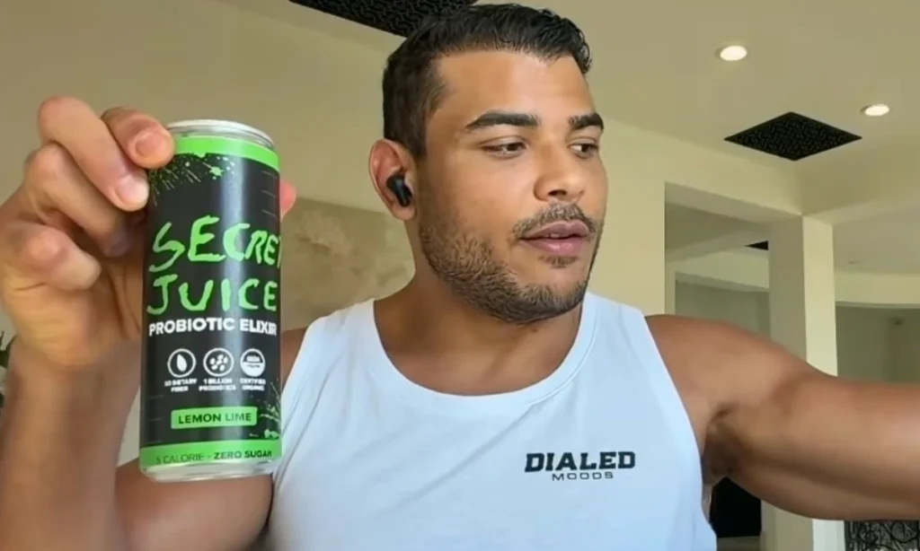 The black can with a green splash paint design labeled “Secret Juice Probiotic Elixir,” which Costa plans to sell soon on e-commerce platforms or on his website, is a zero-sugar 5-calorie drink with dietary fibers, a ton of probiotics, and, of course, is certified organic.