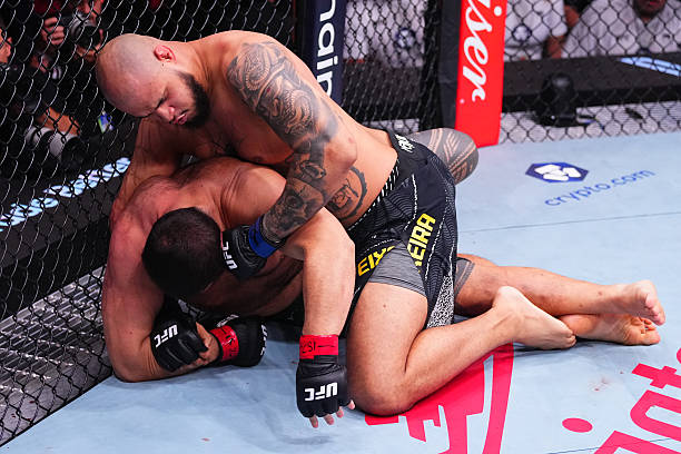 Tuivasa looked to put pressure on Teixeira early, but that allowed the Brazilian to score an easy takedown near the fence. Tuivasa worked his way back up, but Teixeira quickly put him back on the mat, landing in full mount and fishing for an arm-triangle choke.